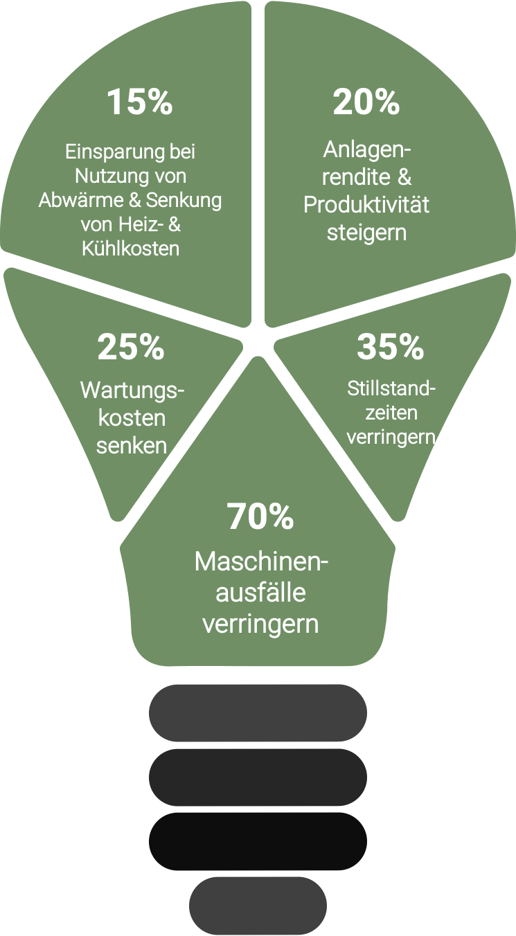 Durch eine kundenspezifisch konfigurierte grafische Darstellung der Messwerte können alle aktuell relevanten Ereignisse im Blick behalten, sowie historische Daten in definierbaren Zeitintervallen analysiert werden. Damit steht ein Werkzeug bereit, um den Verbrauch aller Energieträger zu senken, Ausfallzeiten prozessbestimmender Maschinen zu vermeiden und damit sowohl einen höheren Cashflow zu generieren als auch eine deutlich verbesserte CO2-Bilanz zu erreichen.